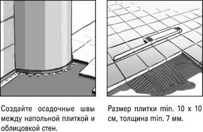 Между облицовкой стен и напольной плиткой создаем осадочные швы. |